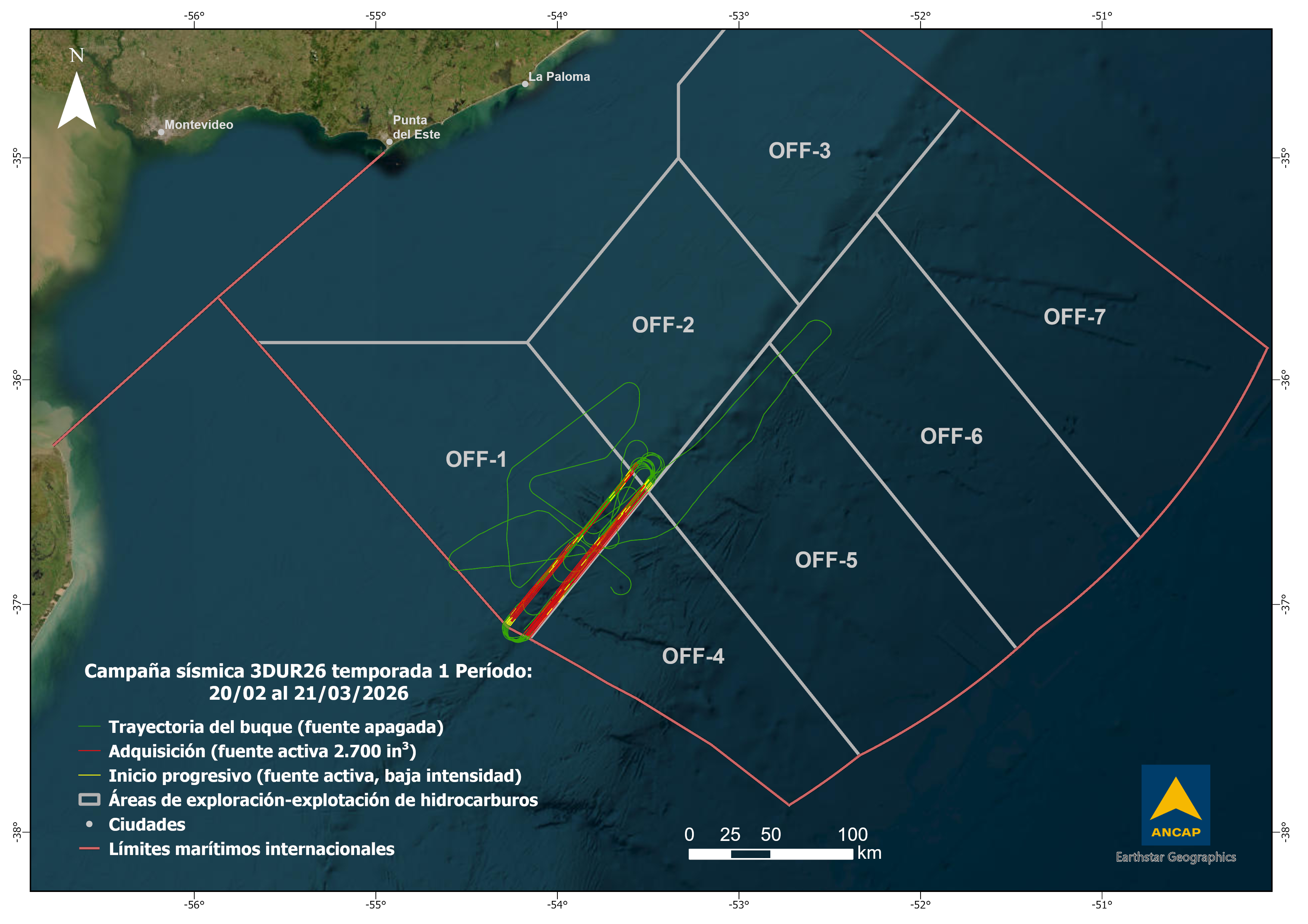 The 3DUR26 seismic survey, carried out under ANCAP’s multi-client agreement with CGG Services US Inc (Viridien), began on March 1 with the deployment of streamers from the seismic vessel BGP Prospector. The operation is supported by the supply vessel Moonrise G and the Uruguayan-flagged chase boat WP Halle. On March 6, the seismic source was deployed for the first time, followed by testing and calibration, and the first data was acquired the next day. By Sunday, March 22, a total of 564 km² of seismic data had been collected, representing 22% of the target for season 1.