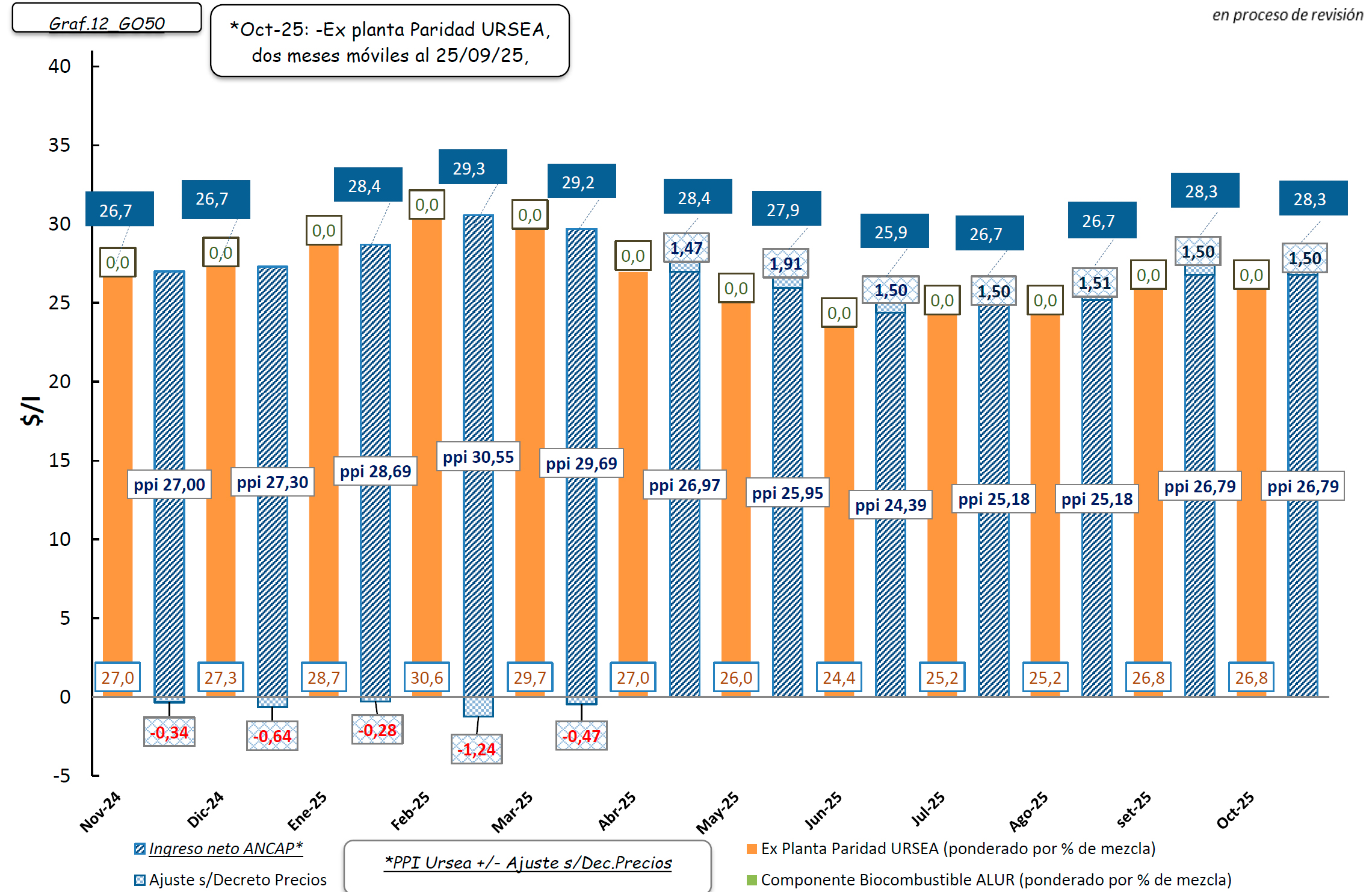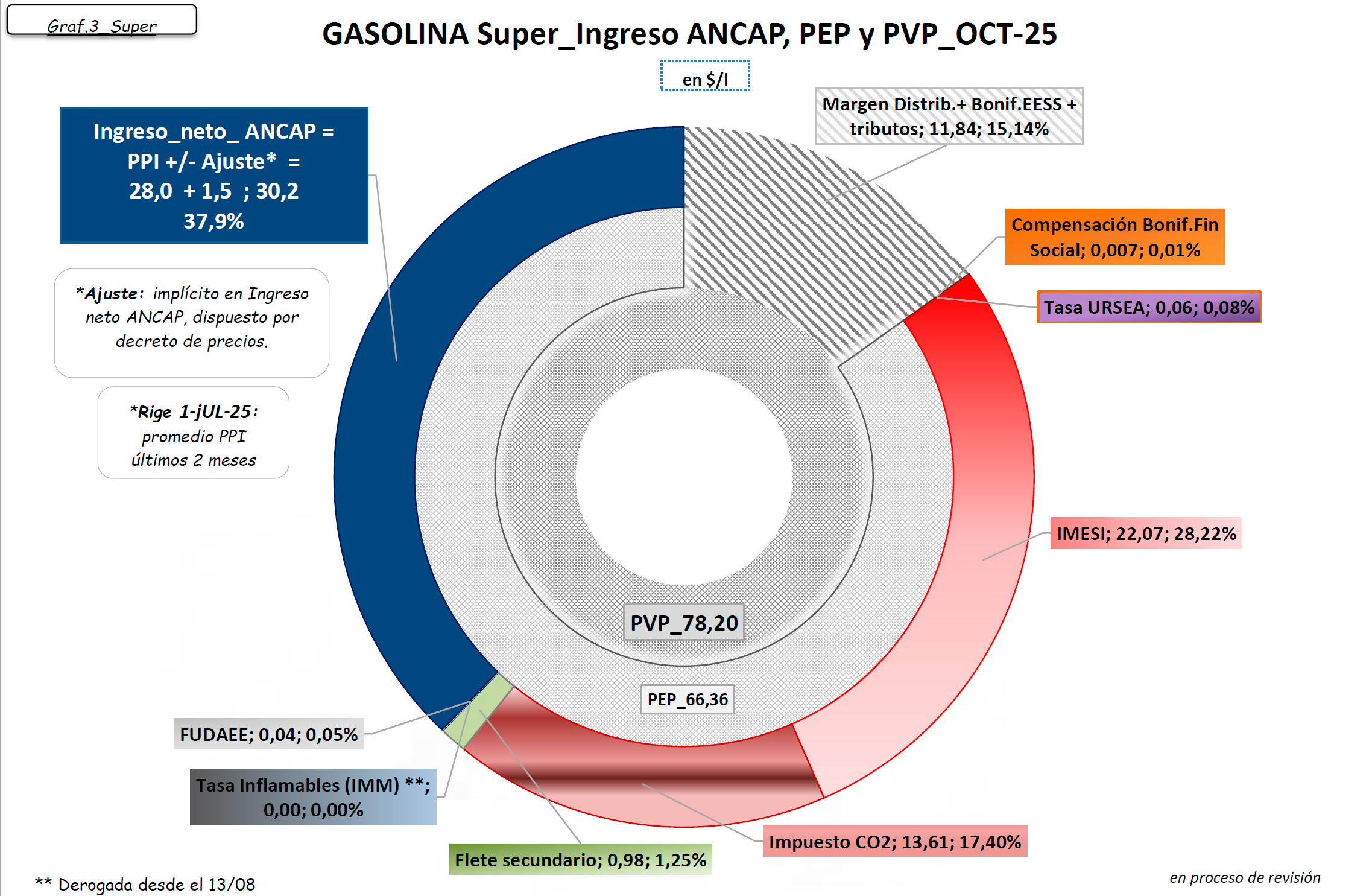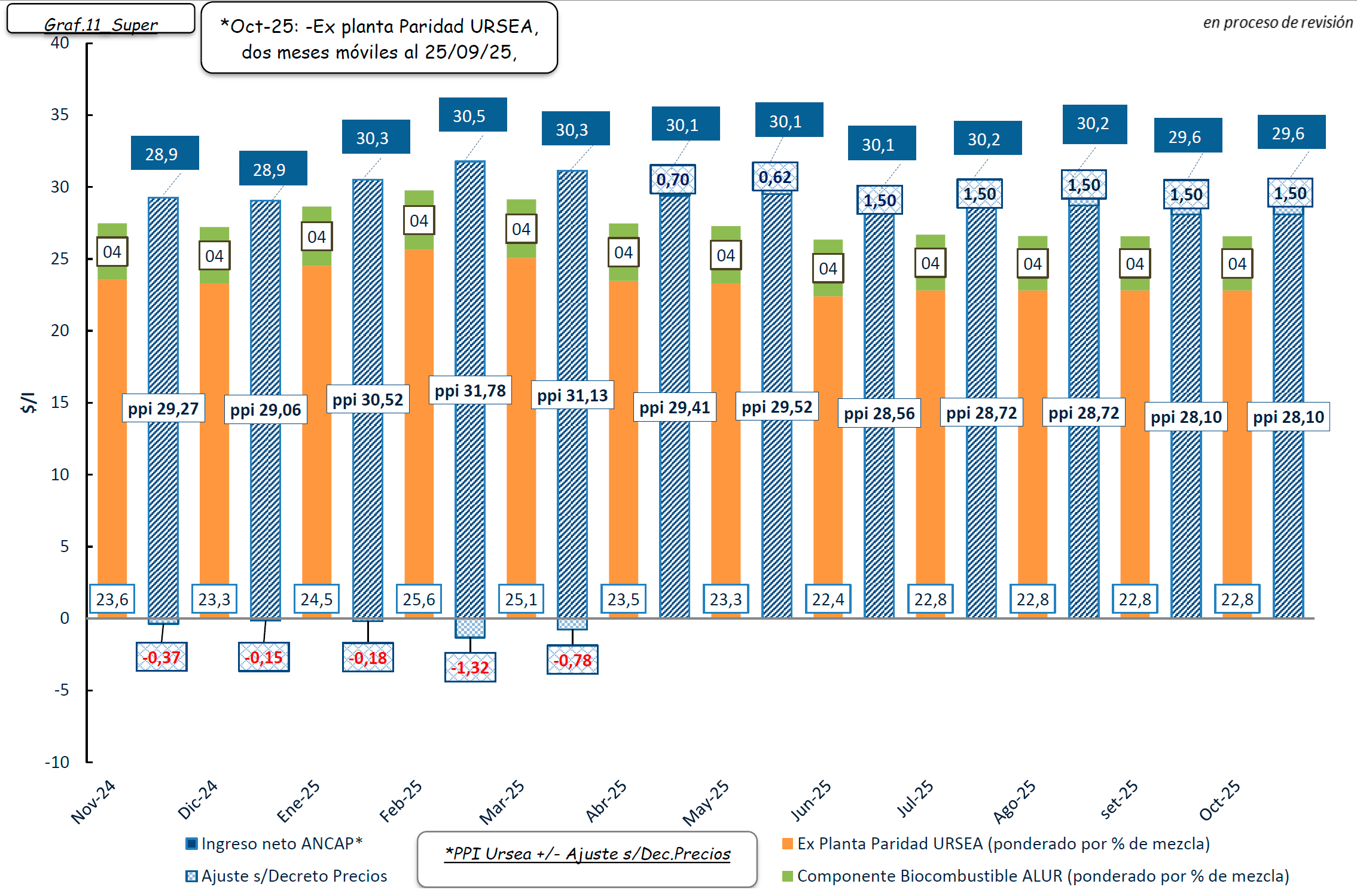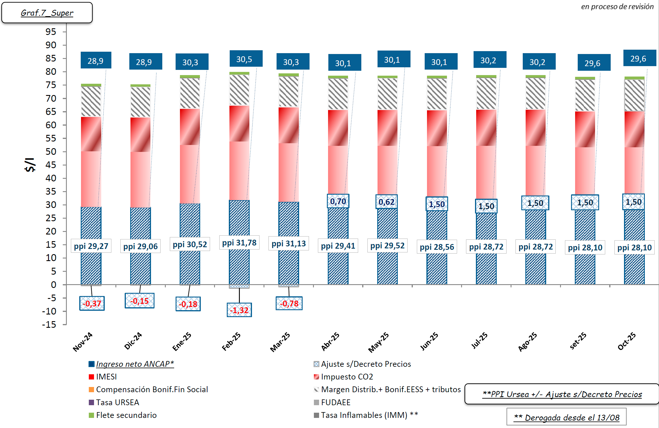 Nota: Desde agosto 2021 los precios de las Gasolinas y el Gasoil 50 S incorporan el factor X. Este factor mayoritariamente corresponde al subsidio del Supergás que surge como consecuencia de no fijar el precio de éste a la paridad de importación y venderlo por debajo de dicha referencia. También se incluye un adicional que reconoce el hecho de incorporar 10% de Bioetanol de origen nacional en la Gasolinas (5% por encima de lo reconocido por URSEA).