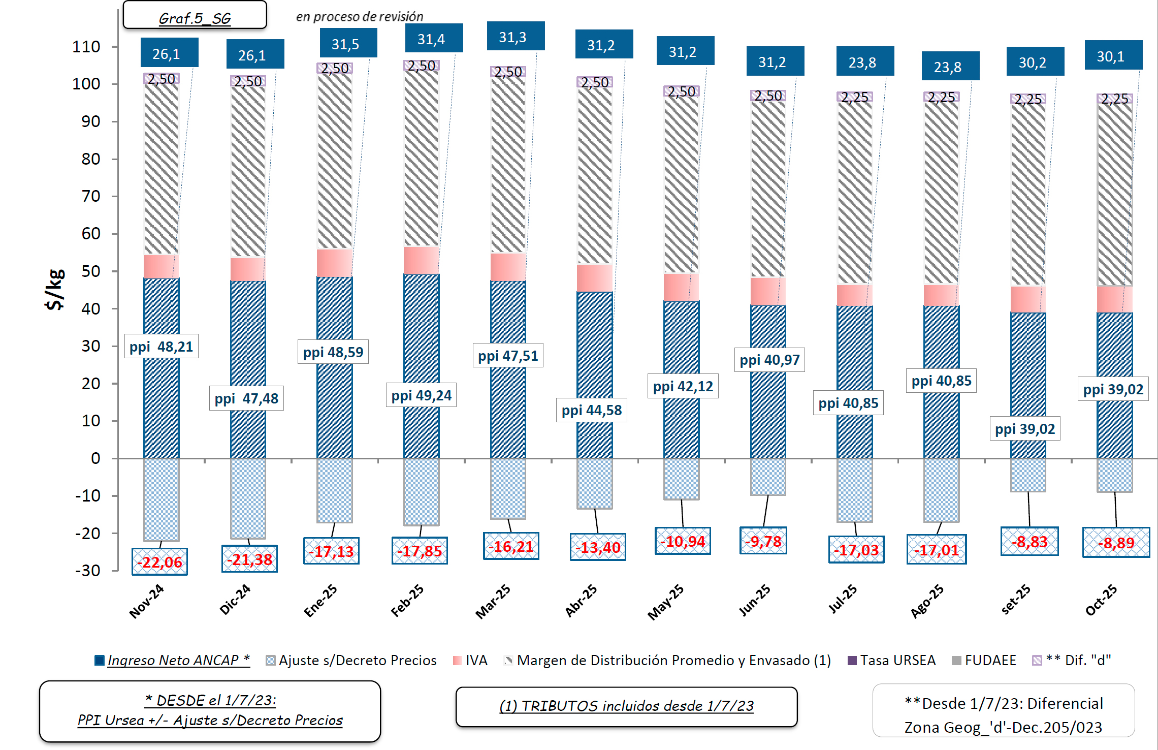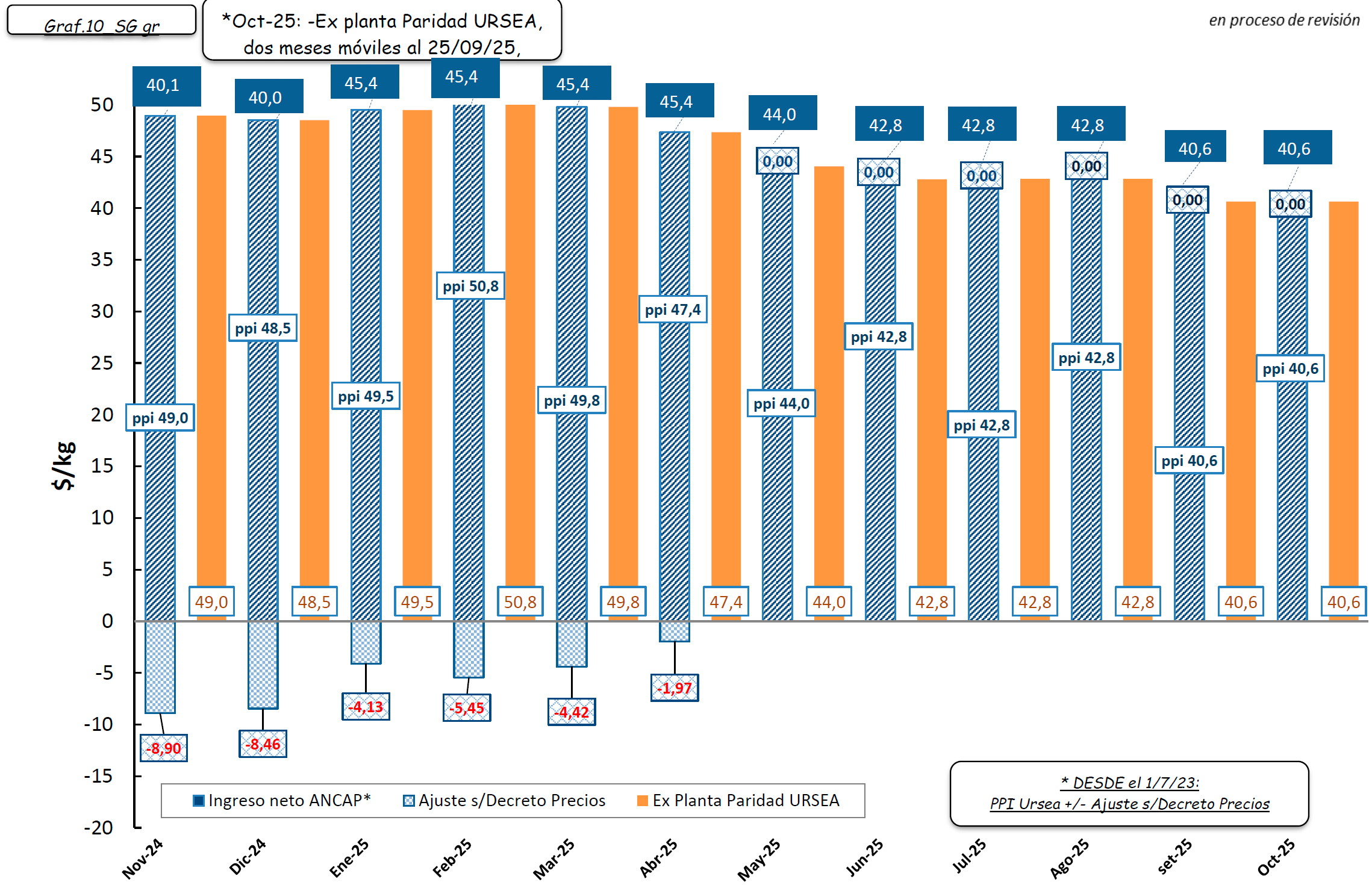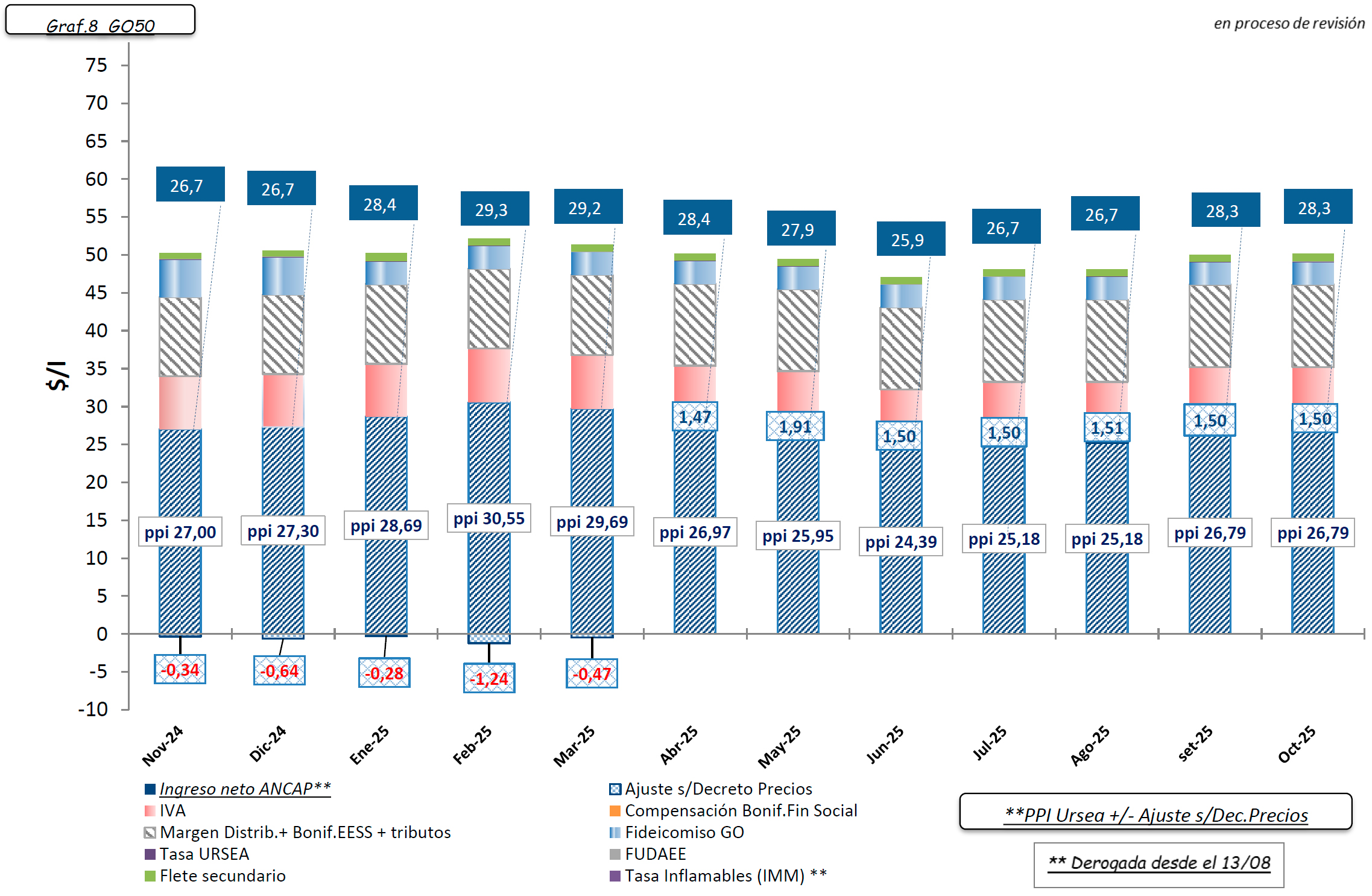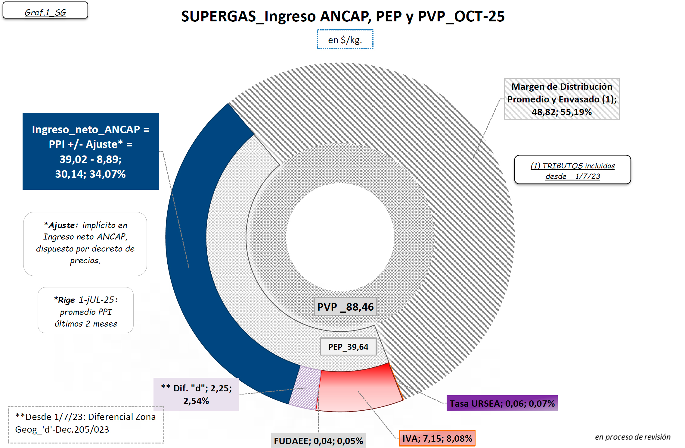 Nota: Desde agosto 2021 los precios de las Gasolinas y el Gasoil 50 S incorporan el factor X. Este factor mayoritariamente corresponde al subsidio del Supergás que surge como consecuencia de no fijar el precio de éste a la paridad de importación y venderlo por debajo de dicha referencia. También se incluye un adicional que reconoce el hecho de incorporar 10% de Bioetanol de origen nacional en la Gasolinas (5% por encima de lo reconocido por URSEA).